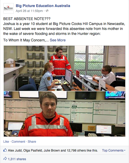In the wake of the floods and extreme weather in the Hunter Region of NSW a couple of weeks ago, Big Picture Education was forwarded an absentee note from the mother of a Cooks Hill Campus student. The note detailed Joshua's tireless and enthisiastic volunteer work for the State Emergency Service.
