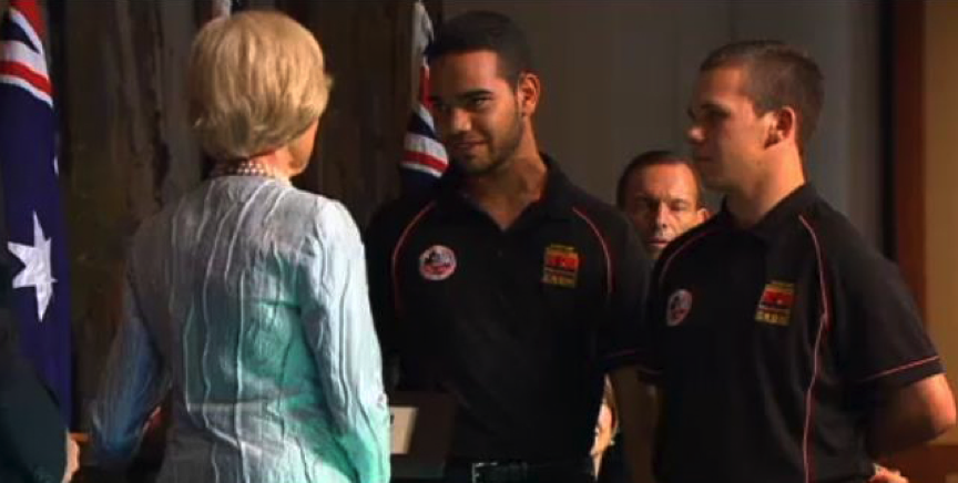 As part of the farewell to outgoing Governor General Quentin Bryce, Nathan and Tai from Brewarrina Central School presented her with an award of appreciation from the Clontarf Foundation. This was done in front of the Prime Minister Tony Abbott, the Leader of the Opposition Bill Shorten, and one thousand guests on national televison - ABC 24.